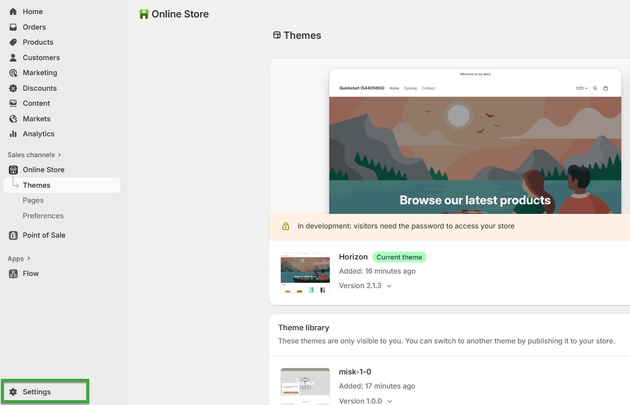 القالب يدعم الإتجاهين RTL و LTR أي سواء اتجاه العربي من اليمين إلى اليسار أو اتجاه الإنجليزي من اليسار إلى اليمين ويتم تغييره أوتوماتيكيا حسب اللغة. لتغيير اللغة للعربية يرجى التوجه للوحة تحكم شوبيفاي، اضغط على Settings أسفل الشريط الجانبي لدخول الإعدادات الخاصة بالموقع كما هو موضح في الصورة التالية: